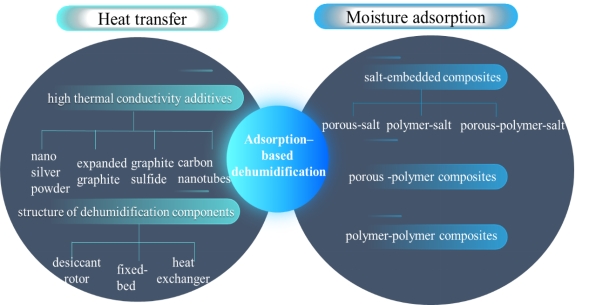 单一的干燥剂材料例如多孔物理干燥剂、吸湿性盐以及吸湿性聚合物,存在着或吸湿能力低或再生温度高或潜在腐蚀等问题。而复合干燥剂的出现能够很好的改善单一干燥剂存在的问题,对此,公司郑旭团队针对近年来基于吸附除湿的复合干燥剂材料进行全面综述,从传热与传质两个角度出发,介绍了如何提升传热性能和如何改善吸湿性能的途径。