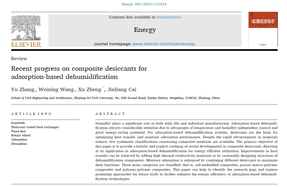 近日,公司郑旭教师团队在Energy上发表了题为“Recent progress on composite desiccants for adsorption-based dehumidification”的综述论文,报道了近年来固体除湿领域复合干燥剂的研究进展。公司研究生张渝同学为论文的第一作者,建工公司郑旭副教授为该论文的通讯作者,研究生王玮宁和蔡金良为联合作者。《Energy》是一本国际性的、多学科的能源工程与研究杂志,涵盖机械工程和热科学的研究。2023年影响因子为9.0,中科院一区TOP期刊。