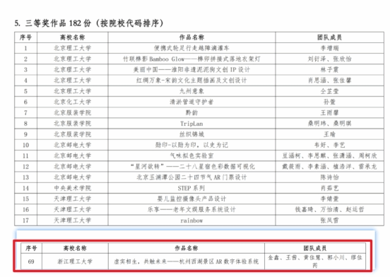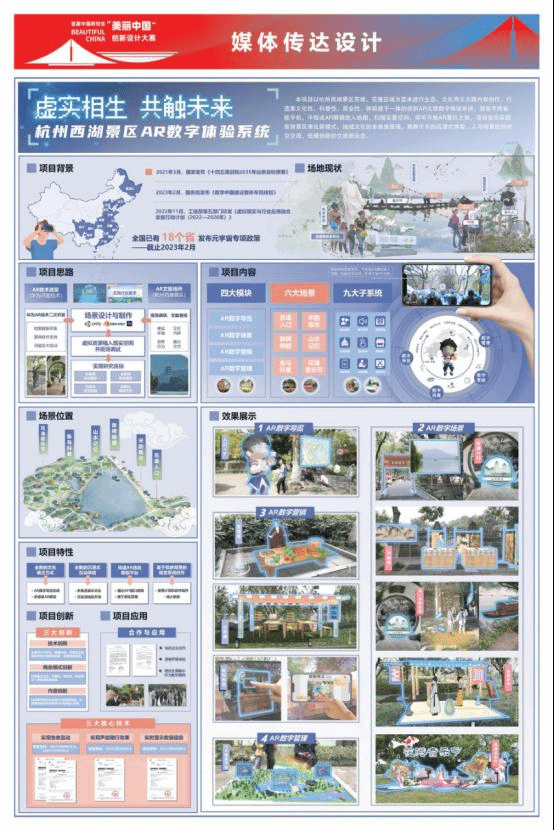 11月26日,由教育部学位管理与研究生教育司指导、中国学位与研究生教育学会和中国科协青少年科技中心主办的首届中国研究生“美丽中国”创新设计大赛在杭州建德落下帷幕。首届中国研究生“美丽中国”创新设计大赛于2023年6月12日正式启动,设置有环境空间设计、服装与服饰设计、工业产品设计、媒体传达设计、建德主题设计五个不同赛道。大赛赛程历时6个多月,来自全国304所高校和科研院所的5943支团队、15559名研究生踊跃参与,参赛规模居中国研究生创新实践系列大赛16项主题赛事前三。此次大赛共有284份作品进入等级奖名单,公司麻欣瑶、胡广老师指导的研究生项目《虚实相生,共触未来一一杭州西湖景区 AR 数字体验系统》荣获全国三等奖,这也是公司“红筑未来”AR工作室的成果。