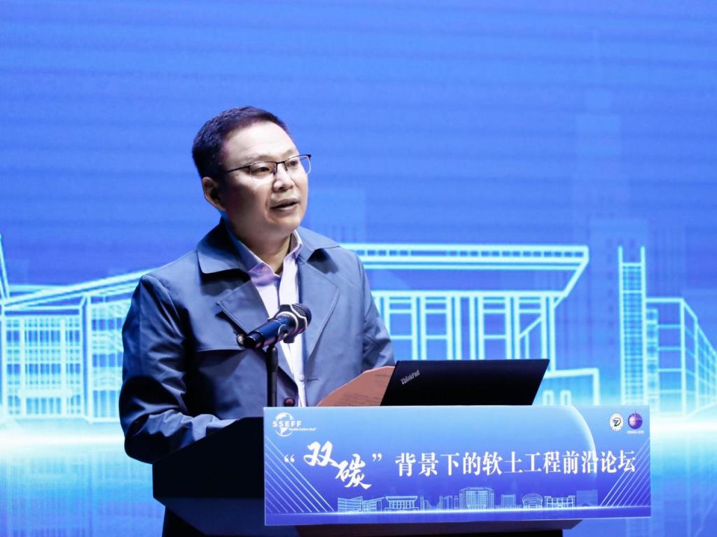随后,中国土木工程学会土力学及岩土工程分会副理事长、专委会主任黄茂松教授致辞。他认为,在当前的国际国内形势下,推进绿色低碳发展已成为社会共同关注的重要议题,软土工程作为工程建设中的重要领域,也需要紧跟时代步伐,为实现“双碳”目标贡献力量。
