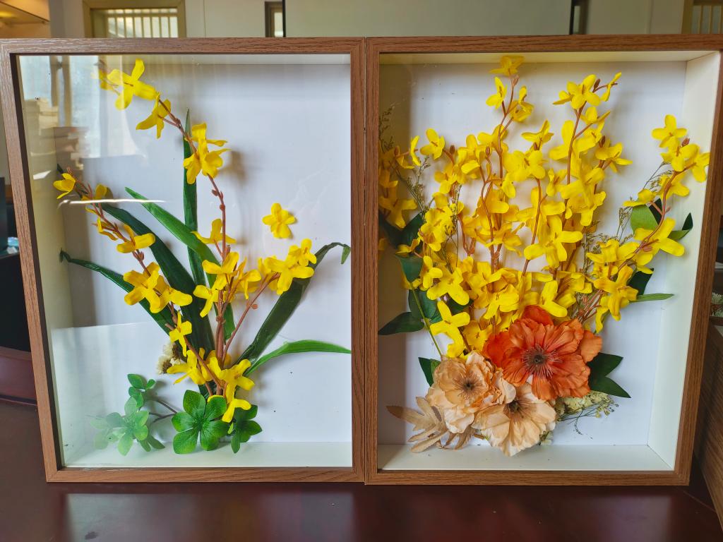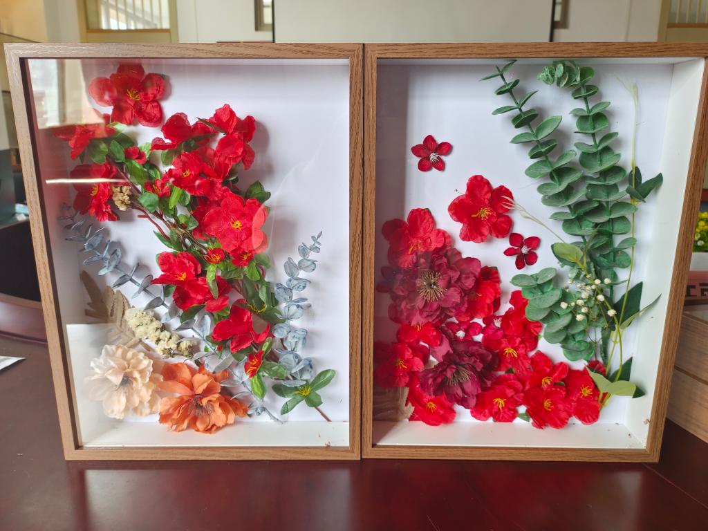 一花一草,道不尽峥嵘岁月;一枝一叶,说不完风雨征程。从革命抗战年代到和平建设年代,每一株花卉的背后,都见证着一段红色记忆。党支部将风景园林专业特色与红色文化教育结合,利用仿真花、干花制作红色花束立体相框装点公司红色文化长廊,展现建工学子风采,青春献礼党的二十大。