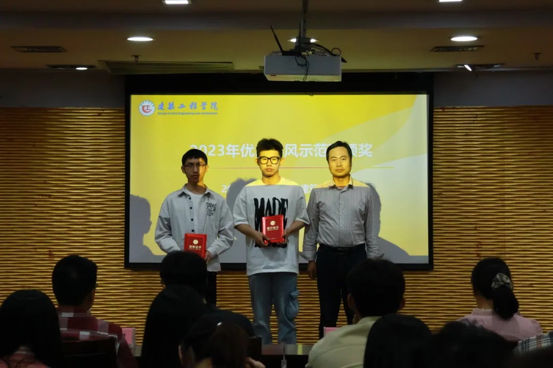 李浪浪、吕超、王欢欢和杨博依次为建环新生奖学金获奖员工、2023-2024学年优良学风寝室以及2023学年优良学风示范班获奖员工代表颁奖,同时对过去一年学风建设中的先进典型进行表彰。