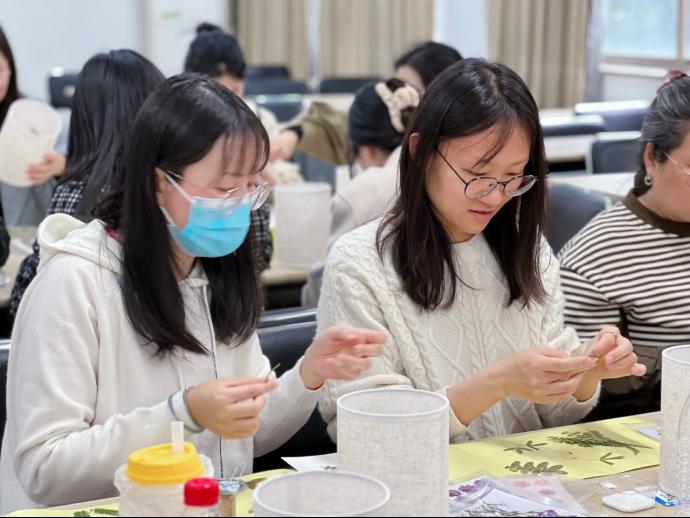 活动现场,指导老师首先向大家讲解了台灯压花的制作方法和注意事项。在领取台灯和选定心仪装饰花材后,大家纷纷迫不及待地开始尝试。从构思到平面构图,再刷胶、贴花、修改打磨……如同雕琢艺术品一般,老师们认真装饰着自己手里的台灯,经过一道道工序,“私人订制”的花艺台灯惊艳出炉。