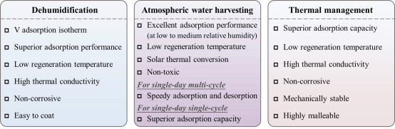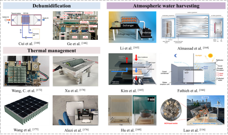 最后,对MOFs及其复合吸附剂在除湿、空气取水和热管理领域的最新应用成果进行了详细介绍,分析了MOFs在不同领域下应用的作用机理,从理论和应用两个层面展现了其巨大的应用潜力,并针对不同的应用环境及MOFs-吸附剂本身特性,总结了各应用领域理想MOFs吸附剂的特性。