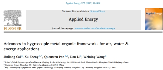 近日,我校郑旭教师团队在《Applied Energy》上发表了题为“Advances in hygroscopic metal-organic frameworks for air, water & energy applications”的综述论文,报道了近年来吸湿性金属有机框架材料(MOFs)在空气、水、能源领域的研究进展。本文第一作者是公司研究生蔡金良,通讯作者是郑旭副教授。《Applied Energy》是世界能源领域著名学术期刊,涵盖能源创新、可再生能源、清洁技术等领域前沿研究。最新影响因子为10.1,为中科院一区TOP期刊。