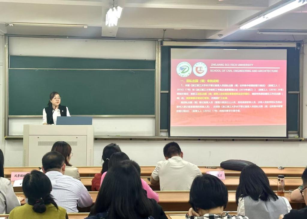 随后,李娜对教职工出(国)境管理工作和兼职管理规定等师德师风建设工作进行了主题宣讲,对相关情况进行了通报,对政策进行了深入解读。李娜指出,当前,全校上下正在开展深入贯彻中央八项规定精神学习教育,要把党的作风建设和规范教师从教行为相结合,广大教师要坚持法律法规和政策制度的学习,明晰并严格遵守出国(境)和校外兼职的相关要求,杜绝违反相关政策制度的行为发生,做有高尚师德的“四有”好老师。