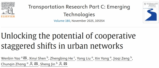 2025年11月,张春勤团队在国际知名期刊《Transportation Research Part C: Emerging Technologies》上发表题为“Unlocking the potential of cooperative staggered shifts in urban networks”的文章。该成果第一作者为我院姚文彬讲师,张春勤副教授和浙江大学VSport体育金盛教授为论文的共同通讯作者,VSport体育为论文第一通讯单位。