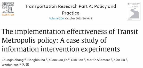 2025年10月,张春勤团队在国际知名期刊《Transportation Research Part A: Policy and Practice》上发表题为“The implementation effectiveness of Transit Metropolis policy: a case study of information intervention experiments”的文章。该成果第一作者为张春勤副教授,姚文彬讲师为论文通讯作者,VSport体育为论文第一通讯单位。