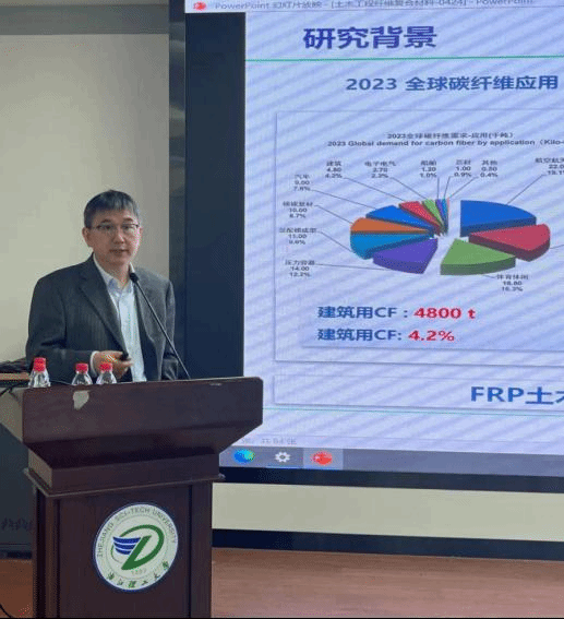 咸贵军教授做了题为“先进土木工程纤维复合材料及其应用研究”的报告,从先进土木工程纤维复合材料的研究背景出发,介绍了碳纤维复合材料加固钢管道、热塑性复合材料筋、FRP 耐久性研究等方面的研究成果,认为FRP土木工程应用是土木工程与纤维复合材料的重大机遇。